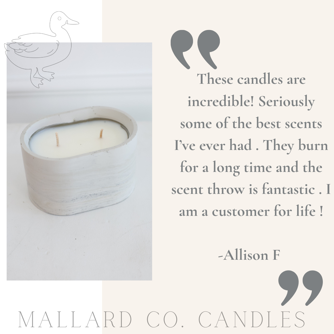 Gracefully designed and beautifully functional, this 8 oz candle is hand-poured into a marble-look, artisan-crafted concrete vessel that brings refined beauty to any space. Made with a premium soy-blend wax, phthalate-free fragrance oils, and two cotton wicks, it delivers an even burn that lasts over 35 hours.
